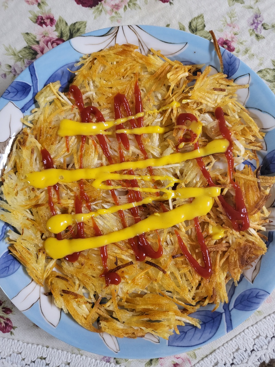 감자를 채 썰어서 프라이팬에 기름을 부어서 먹음직스러운 감자튀김 전을 만들어봤습니다.