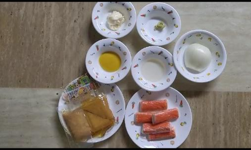 준비물: 밥, 크래미, 유부(시중에 파는 것), 마요네즈, 머스타드, 고추냉이, 식초, 양파 (반개)