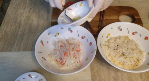 2. 크래미를 손으로 잘게 잘라주세요.
